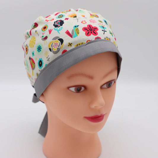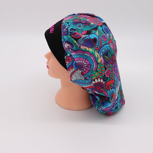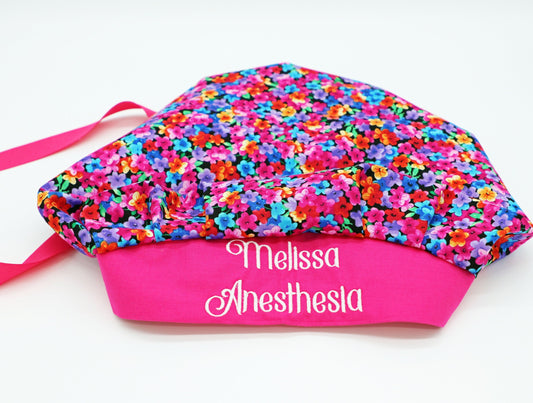 Bright Flowers Bouffant/Ponytail Holder Scrub Cap, RN Scrub Cap, Custom Scrub Cap, Embroidered Scrub Cap, Medical Surgical Scrub Cap